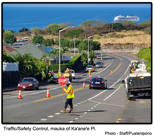 Traffic safety along Puapua`anui Street go as far back as 2012 when residents first took it upon themselves to start a sign waving campaign. Thanks to the PEK traffic committees that followed, the street striping, No Parking signs, bike lanes, traffic mirror, electronic signs and speed tables have become a reality. Mahalo nui loa to the Department of Public Works Traffic Division for getting the project done.