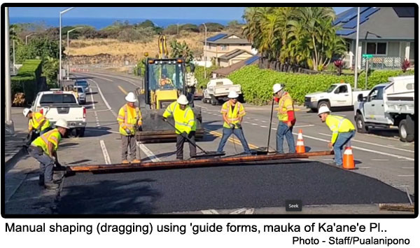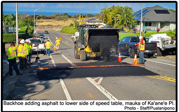 Speeding has been a safety problem over the years. Reckless drivers continued to exceed the posted speed limit (25MPH) causing pedestrians--such as kupuna, keiki, and others--to scurry across the street to get to safety. Drivers entering/exiting the intersections along Puapua`anui Street may now have less of a risk of an accident as the result of the new speed tables.