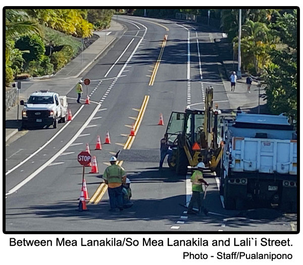 Traffic safety along Puapua`anui Street go as far back as 2012 when residents first took it upon themselves to start a sign waving campaign. Thanks to the PEK traffic committees that followed, the street striping, No Parking signs, bike lanes, traffic mirror, electronic signs and speed tables have become a reality. Mahalo nui loa to the Department of Public Works Traffic Division for getting the project done.